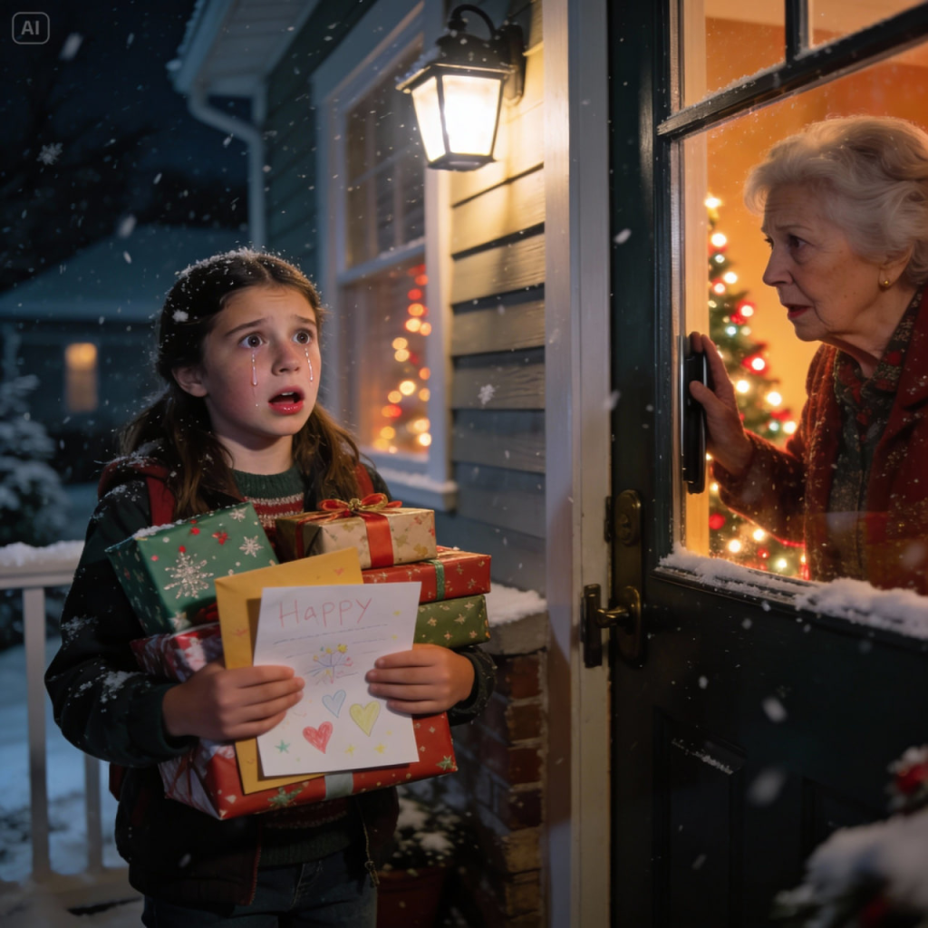 La cámara del timbre de la Sra. Patel había captado a Lily de pie en el porche con los regalos envueltos, esperando. Se podía ver a mi madre moverse por la ventana, detenerse y luego retirarse. Un instante después, la luz del porche se apagó. Lily se quedó allí un segundo más y luego se dio la vuelta, con los hombros hundidos por el peso de las bolsas.