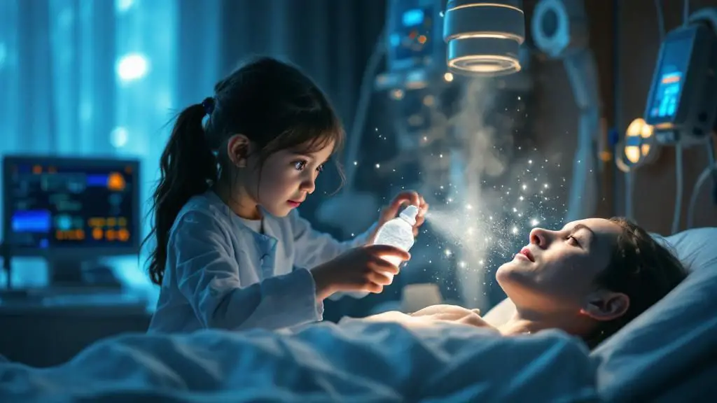 Pero la niña ya había actuado. Con una delicadeza sorprendente, desenroscó la tapa de la botella. Elías y Sofía observaron, petrificados, cómo el líquido azul verdoso se agitaba suavemente. La niña levantó la botella y, con un movimiento suave y casi ritual, roció unas gotas del líquido sobre el rostro de Marcos.