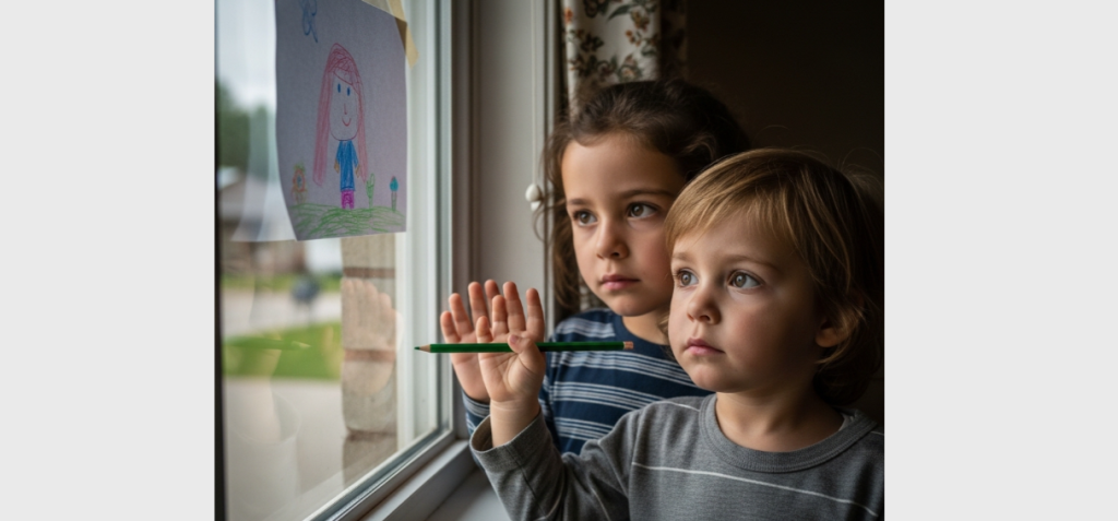 Curiosa, me acerqué sigilosamente, espiando por la rendija. Estaban acurrucados en el suelo con lápices de colores y una hoja de papel extendida entre ellos.