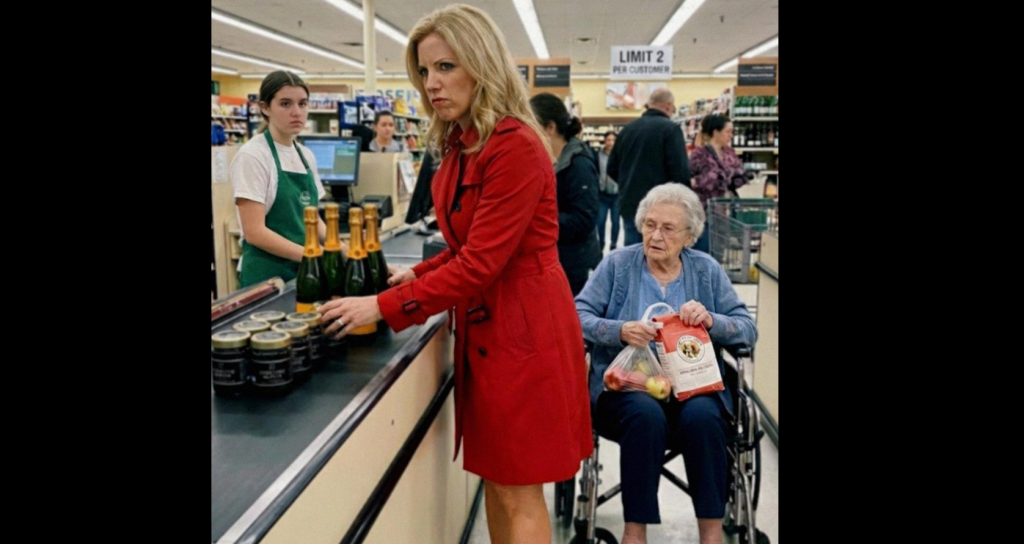 Su carrito rebosaba de lujo: champán, wagyu, caviar, cosas envueltas como regalos. Ni siquiera miró la fila.