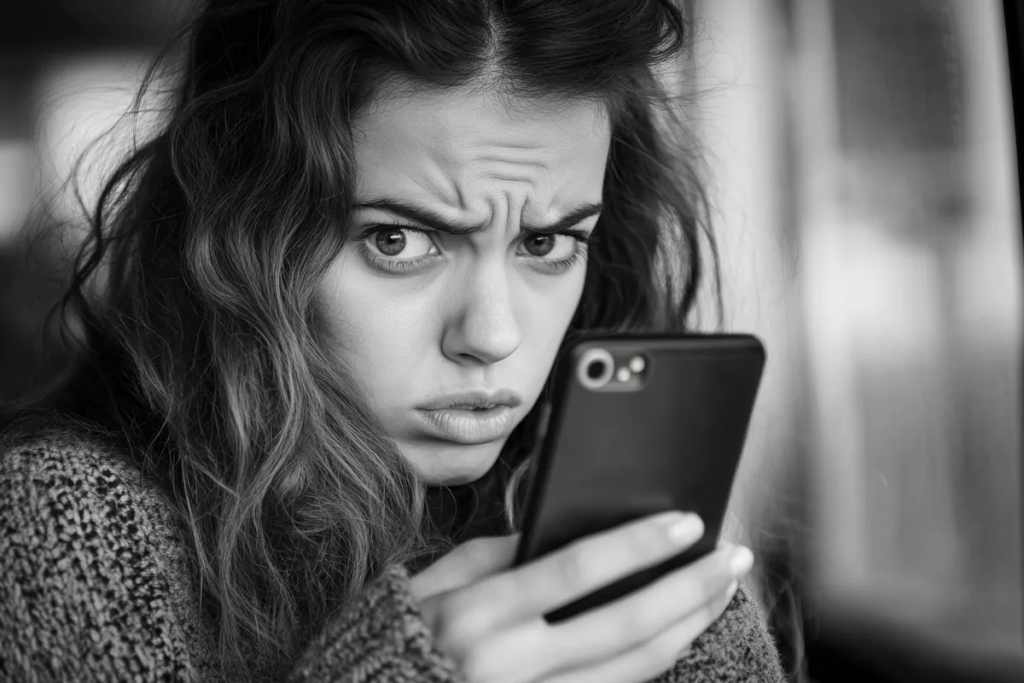 Una mujer frunce el ceño mientras consulta los mensajes de su teléfono | Fuente: Midjourney