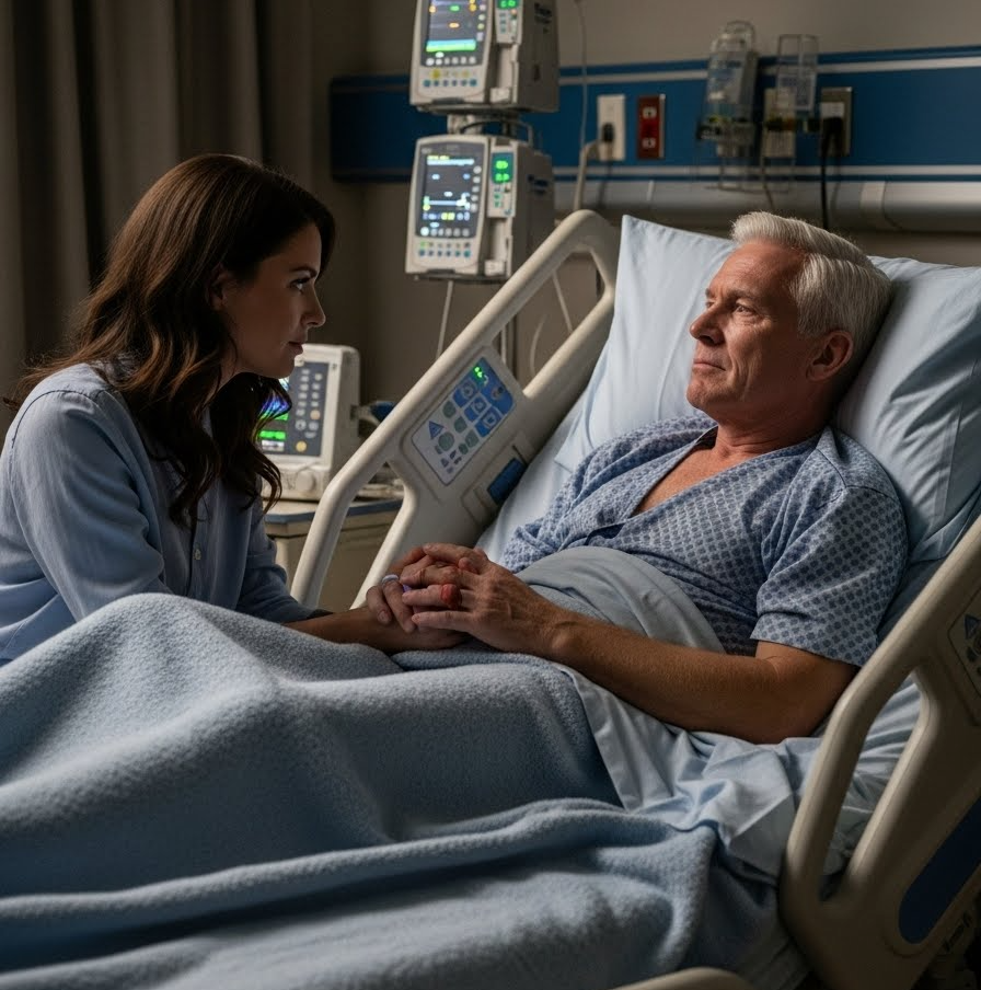 Una noche, las máquinas zumbaban suavemente a su lado. Lily y Chloe dormían en la sala de espera. Me senté junto a su cama, ajustándole la manta, cuando su mano rozó la mía; débil, desesperada.
